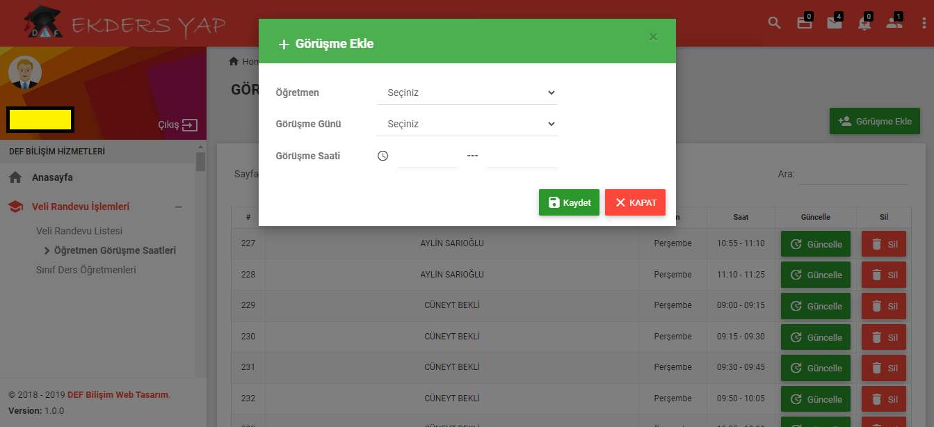 Ekdersyap otomasyonu bünyesinde olup okullarda öğretmen veli iletişiminin sağlıklı bir şekilde yürütülmesi için oluşturulmuş bir uygulamadır. Bu uygulama ile öğretmenlerin görüşme saatleri sisteme tanımlanır ve veliler sistem üzerinden randevu oluşturmaktadır. Randevu bilgileri sms ile hem veli hem öğretmene ulaşmaktadır.